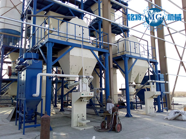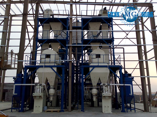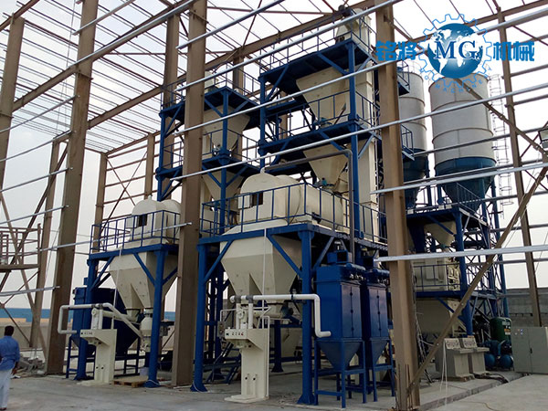 鄭州銘將機(jī)械設(shè)備有限公司研發(fā)生產(chǎn)的全自動(dòng)保溫砂漿生產(chǎn)線,一般情況下會(huì)用到4-6個(gè)原料罐,兩個(gè)大罐用于裝放散裝水泥和粉煤灰,其余小罐用于裝放輕鈣、重鈣、砂、小料等。散裝水泥和粉煤灰進(jìn)罐不需要提升設(shè)備,依靠泵車(chē)打入。輕鈣、重鈣、砂、小料等需要使用斗式提升機(jī)提入小罐,巧妙的物料分配系統(tǒng)支持一個(gè)斗式提升機(jī)分配式作業(yè),從而避免了資源浪費(fèi)。計(jì)量系統(tǒng)在計(jì)量螺旋的配合下,把料倉(cāng)中的原料導(dǎo)入計(jì)量倉(cāng),通過(guò)傳感器的數(shù)據(jù)反饋,實(shí)現(xiàn)原料計(jì)量。計(jì)量好后的物料,通過(guò)螺旋輸送機(jī)導(dǎo)進(jìn)主斗提機(jī),提升到混合機(jī)上部待混料倉(cāng)中。待混倉(cāng)為氣動(dòng)大開(kāi)門(mén)型,可以迅速將待混物料放入無(wú)重力混合機(jī),實(shí)現(xiàn)保溫砂漿連續(xù)生產(chǎn)。