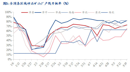 河南駐馬店砂石礦山廠反饋:5月19日,日均出貨量為8000噸,周度出貨量為56000噸,2條線全開(kāi)。環(huán)比上周增加23000噸,目前周邊城市大部分都已解封,出貨量增加,預(yù)計(jì)下周持平。