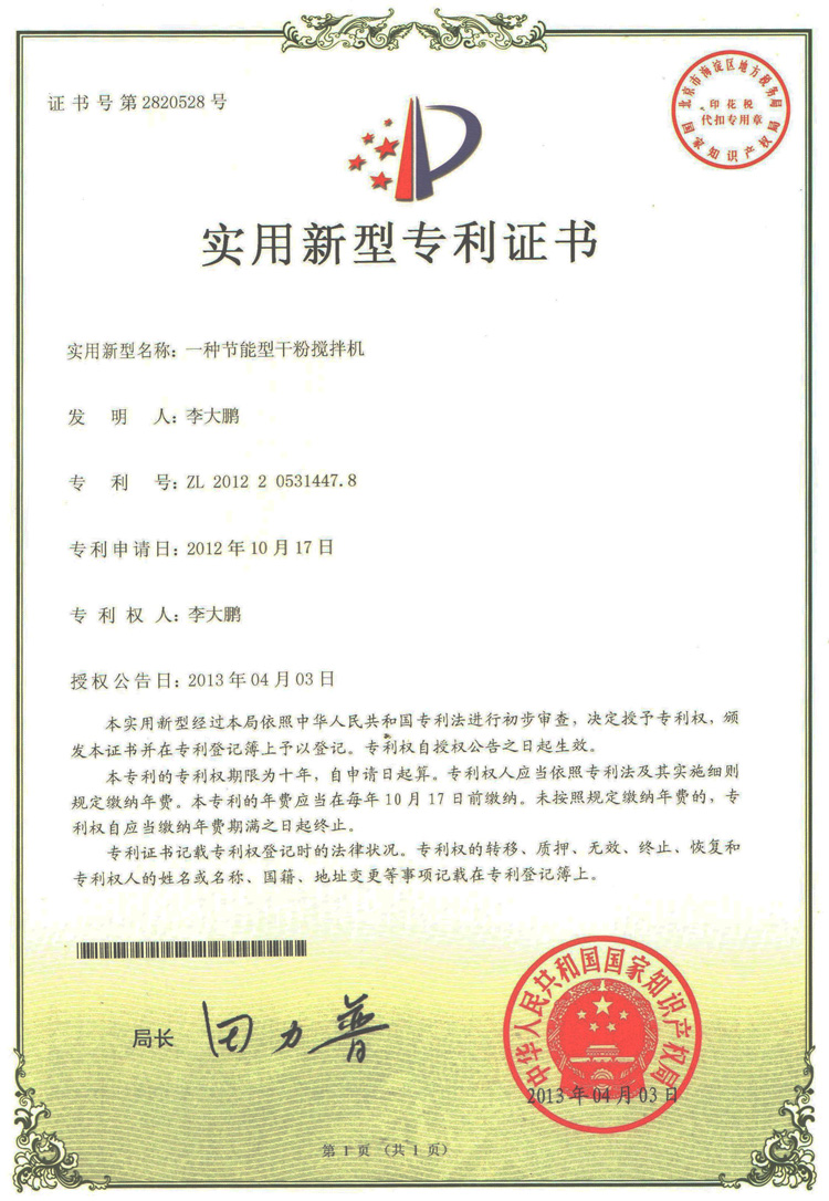 上一篇:干粉攪拌機外觀設(shè)計專利證書